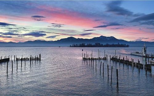 über den Chiemsee. Die Fraueninsel mit ihrem markanten Kirchturm erwartet den neuen Tag. Bei leicht föhnigem Wetter gibt es auch im Winter immer wieder bezaubernde Lichtstimmungen am „Bayerischen Meer“.