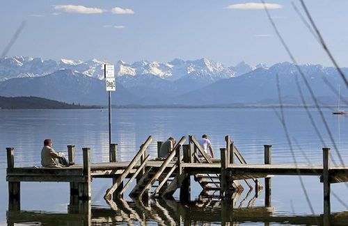 Das verschneite Karwendel im Hintergrund sieht noch ziemlich winterlich aus, doch nicht nur in Possenhofen am Starnberger See lässt es sich in diesen Tagen auch im T-Shirt schon bestens aushalten. Viele Sonnenanbeter genossen unter der Woche bereits das herrliche Wetter an den oberbayerischen Seen u