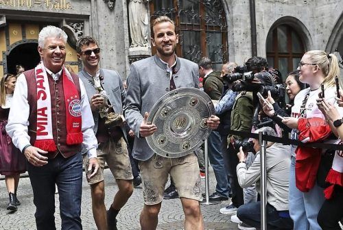 Mit Schal, Kakadu und Schale: OB Reiter, Thomas Müller und Harry Kane (v. li.) machen sich auf den Weg zum Rathausbalkon. Dort feierten die Fußballerinnen und Fußballer des FC Bayern die doppelte Meisterschaft. „Ich bin sicher nicht vom Erdboden verschluckt, sondern bleibe euch erhalten – in welcher