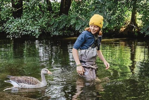 Wasserdicht verpackt in einer Watthose und begleitet von einer Wildgans bewegt sich dieser Bub durch den Fluss Chamb im Bayerischen Wald. Auf dem sogenannten Eisvogelsteig sollen Urlauber durch ein besonders hautnahes Erlebnis für den Naturschutz sensibilisiert werden. Damit kein unfreiwilliges Bad
