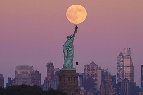 Imposant sieht er aus, der Supermond, der gestern hinter der Freiheitsstatue über New York aufging. Das immer wiederkehrende Schauspiel mit einem teils leicht rötlich schimmernden Trabanten ist durch die nicht kreisrunde Umlaufbahn um unseren Heimatplaneten bedingt. Er entsteht dann, wenn der Mond