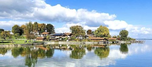 Es waren nicht allzu viele Lücken am Himmel der vergangenen Tage. Aber wenn doch einmal die Wolken aufrissen, dann präsentierte sich die Region in voller Herbst-Pracht, so wie hier die Chiemseeinsel Frauenwörth. Die Besucher und Betrachter blicken auf die Insulaner-Häuser inmitten einer Komposition