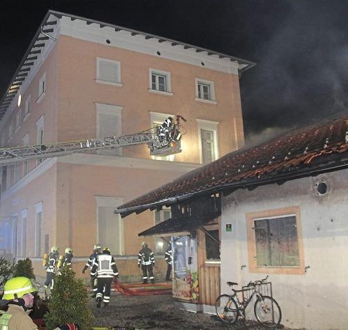 In der Nacht auf Donnerstag ist am Bahnhof von Aschau der Bergbauernladen in Brand geraten. Das Feuer wurde nach Angaben der Polizei gegen 4 Uhr gemeldet. Die alarmierten Feuerwehren aus Aschau, Frasdorf und Wildenwart konnten ein Übergreifen der Flammen auf das Bahnhofsgebäude verhindern (Foto: Rei