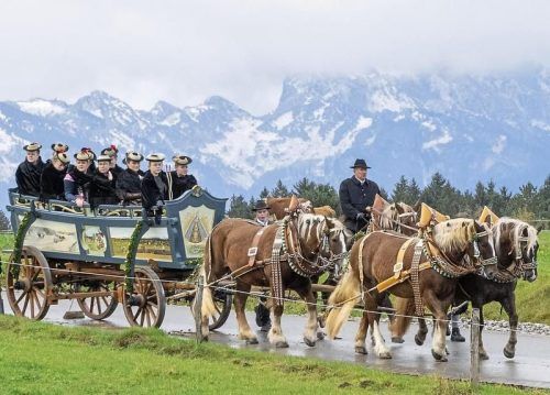 Bei heftigem und kaltem Wind setzte sich am Sonntag die Kutsche zur Leonhardifahrt in Warngau im Landkreis Miesbach vor der Kulisse der Benediktenwand in Bewegung. Die Damen waren froh, dass sie warm eingepackt waren, allerdings flog während der Fahrt so mancher Hut davon. Auch in Fürstenfeldbruck,