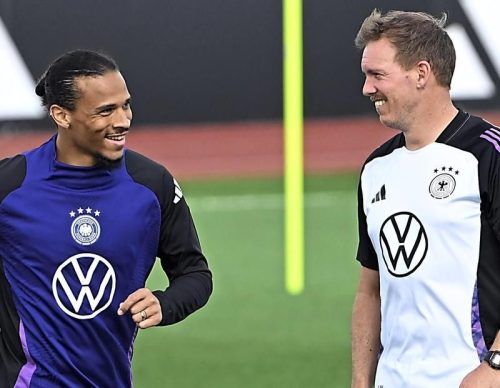 Julian Nagelsmann (re.) hat DFB-Rückkehrer Leroy Sané (Foto: dpa) mit mahnenden Worten in die Pflicht genommen: „Er weiß, dass es nicht mehr unzählige Chancen gibt, sich auf Nationalmannschaftsebene zu beweisen, zumindest unter meiner Führung.“