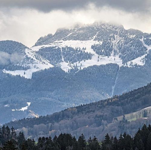 Schneebedeckte Hänge und vereiste Wälder zeichnen die markanten Flanken des Bergmassivs nach, während sich tiefhängende Wolken um die Gipfel legen. Unten dominieren noch die letzten Farben des Spätherbstes, oben herrscht bereits klares Winterlicht – ein eindrucksvoller Übergang zwischen zwei Jahresz