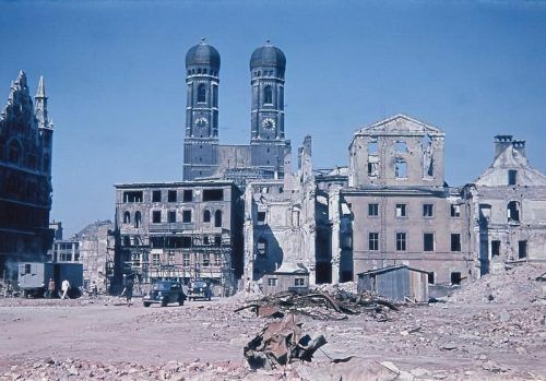 Es ist eine bedrückende Erinnerung: Dieses Farbdia von Dorothea Brockmann zeigt die Trümmerlandschaft vor der Münchner Frauenkirche nach den Bombardements im Zweiten Weltkrieg. Brockmanns Aufnahme ist aktuell in der großen Ausstellung „Stadt in Trümmern. Herbert List und die Ruinenfotografie in Münc
