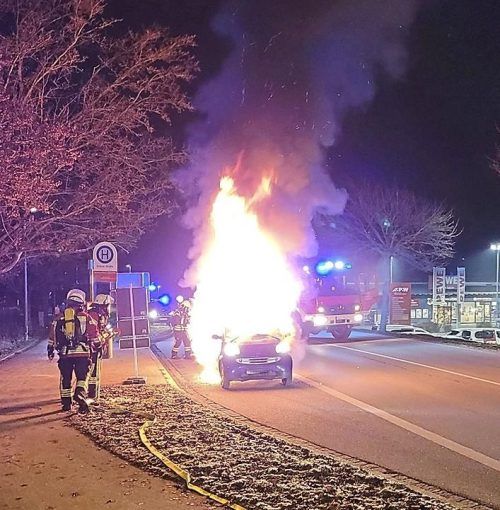 Ein Pkw ist am Samstagabend in Wasserburg in Brand geraten. Dessen Fahrerin war von anderen Verkehrsteilnehmern mit Lichtzeichen auf eine starke Rauchentwicklung am Heck ihres Kleinwagens aufmerksam gemacht worden. Sie konnte den Pkw noch in die Haltebucht einer Bushaltestelle in der Priener Straße