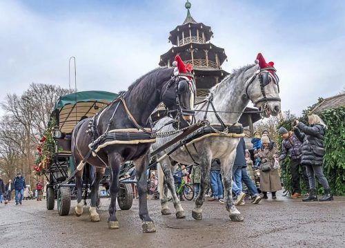 Kalt war‘s und regnerisch. Am Chinesischen Turm in München haben sie sich die Vorweihnachtsstimmung trotzdem nicht vermiesen lassen. Selbst die Pferde trugen nebst Scheuklappen knallrote Weihnachtsmützen und fügten sich so ganz wunderbar in die Kulisse zwischen historischem Kinderkarussell, Eisstock