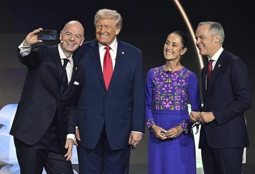 Die Auslosung der Gruppen für die Fußball-Weltmeisterschaft 2026 in den USA, Kanada und Mexiko war eine Show nach dem Geschmack von US-Präsident Donald Trump – hier mit Mexikos Präsidentin Claudia Sheinbaum, Kanadas Premierminister Mark Carney (r.) und Fifa-Boss Gianni Infantino. Um Fußball ging es