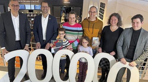 Bei der Ehrung: (von links) Thomas Walkenhorst, Vorstandsmitglied der Sparkasse Rosenheim-Bad Aibling, OB Andreas März, Julian, Sabine, Leonie und Rudolf Sauer, Dr. Jennifer Morscheiser, Leiterin des Ausstellungszentrums, und Florian Englert, Geschäftsführer der Veranstaltungs- und Kongress GmbH Ros