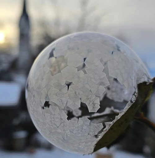 Seifenblasen sind zerbrechliche Kunstwerke. In der Sonne schillern sie, im Wind tanzen sie – und in der Kälte gefrieren sie zu glitzernden, zerbrechlichen Kristall-Objekten. Diesen Schnappschuss einer erstarrenden Seifenblase hat uns Leserin Martina Ostermann aus Hohenthann zugeschickt. Bei minus el