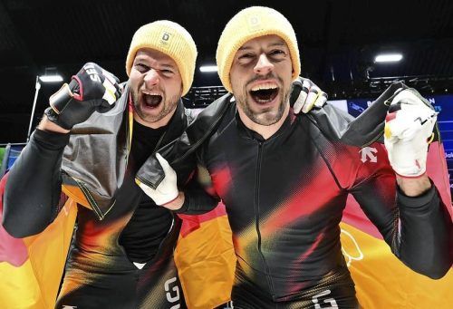 Die deutsche Olympiamannschaft hat ihre fünfte Goldmedaille gewonnen – plus Silber und Bronze. Im Zweierbob siegten der Berchtesgadener Johannes Lochner (l.) und Georg Fleischhauer vor ihren Teamkollegen Friedrich/Schüller und Ammour/Schaller.