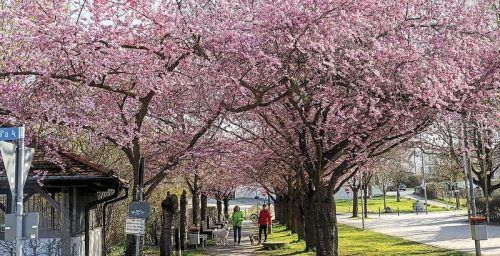 Warum nach Japan reisen, wenn auch in Mühldorfs Inn-Stadt-Park die Allee aus Kirschbäumen wieder in voller Blüte steht? Mühldorfer und ihre Gäste nutzen die zartrosa blühenden Frühlingsboten (Foto: Mayer) auch an Tagen rund um Ostern wieder begeistert als Fotomotiv, wenn sie durch den Park schlender