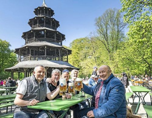 Zugegeben, gestern war der Biergarten-Besuch bei zwölf Grad und frischem Wind eher was für die Hartgesottenen – wie diese Herrschaften, die am Chinaturm ihre Mass genossen. Aber am Wochenende wird’s schön, manche Wetterfrösche sagen sogar 20 Grad voraus.FOTO: MARTIN HANGEN