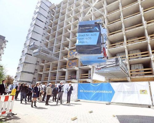 Was da abhebt? Ein fertiges Badezimmer. Ein Kran zieht den schweren Block nach oben, dann wird er in eine der Öffnungen des Rohbaus geschoben. So entstehen in Modulbauweise die neuen Apartments in der Münchner Studentenstadt. Gestern gab es erste Einblicke in die 17 Quadratmeter großen Wohnungen.MAR
