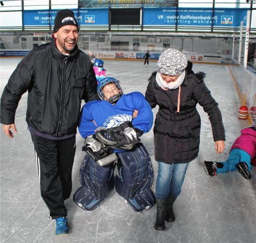 „I glaub, das is nix für mich“, sagt der völlig erschöpfte Nico Richter (Bildmitte), der in einer Nachwuchs-Torwart-Ausrüstung steckt. Beim Tag der offenen Tür des EHC in der Raiffeisen-Arena nutzte der sechsjährige Bub die Gelegenheit, in die schwere Goalie-Ausrüstung zu schlüpfen. Schon als ihn To