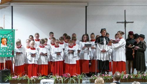 Die große Ministrantenschar der Pfarrei Pürten mit ihren Betreuerinnen überraschte mit der „Litanei 08/15“.