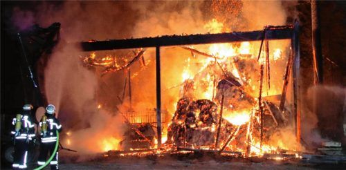 Waldkraiburg – Rund 40000 Euro Schaden. Auf diese Summe schätzt die Polizei den Schaden durch ein Feuer, dem am Freitag ein landwirtschaftlicher Unterstand zum Opfer fiel. Etwa 40 Einsatzkräfte der Feuerwehren Pürten, St. Erasmus und Waldkraiburg, die gegen 20.35 Uhr über die Integrierte Leitstelle
