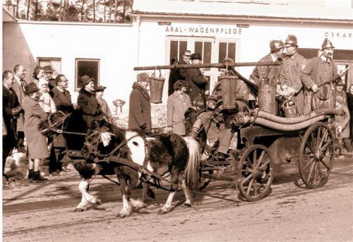Waldkraiburg 1966: Auch damals gab es schon einen Faschingszug, wie dieses Bild beweist, das zwei Ponys mit einem historischen Spritzenwagen der Waldkraiburger Feuerwehr in der Karlsbader Straße (im Hintergrund Tankstelle und Werkstatt Quoos) zeigt. Das Bild aus dem Stadtarchiv ziert das Titelblatt