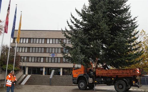 Am Montag tanzten zum Faschingsauftakt noch die Prinzengarden vor dem Waldkraiburger Rathaus, jetzt steht schon der Weihnachtsbaum. Franz Sachs (links unten) und Georg Hingel (kleines Bild) von den Stadtwerken haben am Dienstag die mächtige, fast neun Meter hohe Nordmanntanne, aus Mühldorf geholt un