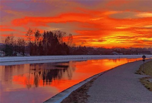 Ganz in Rot, der Innkanal im Sonnenuntergang! So präsentierte sich der Himmel über der künstlichen Wasserstraße vor wenigen Tagen am Fuße der Stadt Waldkraiburg. Udo Kesselgruber hat die Stimmung bei einem Spaziergang für die Leser der OVB-Heimatzeitungen festgehalten. Und vorsichtshalber fügte der