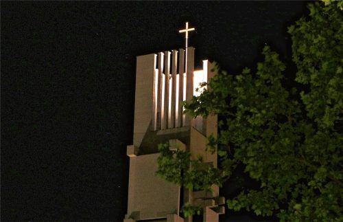 Freistehende Glockentürme kennen die meisten aus Italien. Die berühmtesten Beispiele stehen in Venedig und in Pisa. Mit dem Schiefen Turm kann es der Campanile von Christkönig natürlich nicht aufnehmen – doch für das Zentrum Waldkraiburgs ist das 28 Meter hohe Bauwerk prägend. Besonders nachts, wenn