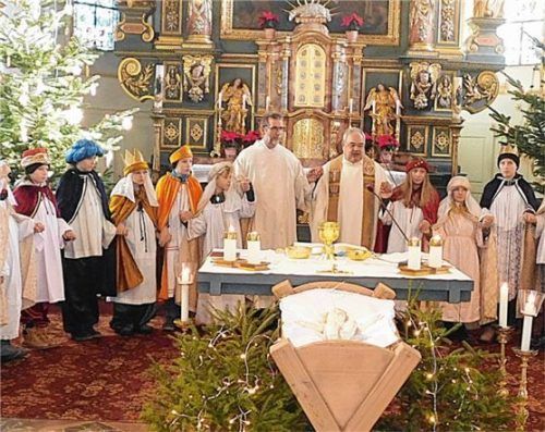 20 Sternsinger haben in Schnaitsee über 3500 Euro gesammelt. Pfarrer Georg Schinagl (rechts) lobte den Einsatz der Kinder und Jugendlichen: „Ihr habt eine weite Reise hinter euch. Ihr habt die Botschaft von Weihnachten in der Pfarrei von Haus zu Haus getragen. Ihr habt Gaben gesammelt für Kinder im