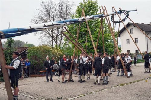 Nach anderthalb Stunden war es unter dem Beifall hunderter Schaulustiger endlich geschafft: Bei strömendem Regen, konnte der knapp 29 Meter hohe und drei Tonnen schwere Maibaum vor der Martinskirche in Babensham mit einem letzten Hauruck in seine endgültige Position gehievt werden – in einer technis