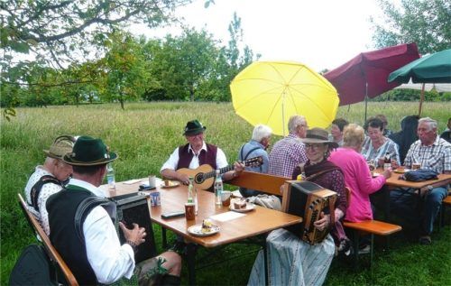 Das ideale Wetter lockte zahlreiche Besucher auf die Streuobstwiese. Vorbereitet von einigen Vorstandsmitgliedern feierten sie zusammen mit Pfarrer Wuchterl beim Kreuz der Familie Kerschl die Maiandacht des Obst- und Gartenbauvereins Edling. Die „Ziachmoni“ spielte Marienlieder. Eindrucksvoll war di