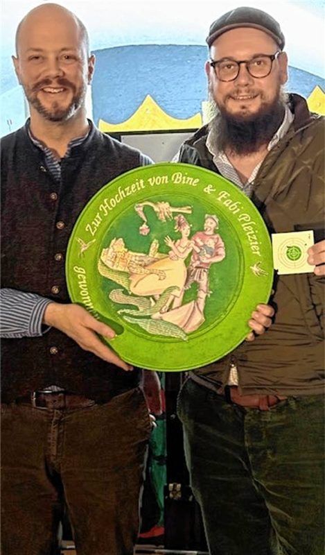 Anlässlich der Hochzeit von Sabine und Fabian Pleizier wurde bei der Ballesterschützengesellschaft Wasserburg eine Hochzeitsscheibe ausgeschossen. Gestiftet hatte sie der Bräutigam selbst. Der Zweite Schützenmeister des Vereins, Bjön Roßwurm (im Bild rechts), sicherte sich dieses Erinnerungsstück mi
