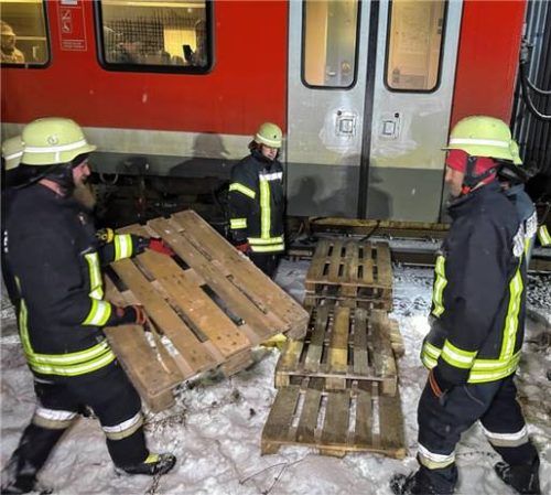 Wegen eines Motorschadens musste ein Zug des Filzenexpress von Wasserburg nach Grafing evakuiert werden. Einsatzkräfte der Feuerwehr Pfaffing sowie des Roten Kreuzes bereiteten den Passagieren eine Treppe aus Europaletten und geleiteten diese zu den bereitstehenden Bussen des Schienenersatzverkehrs.