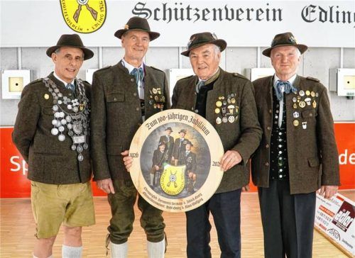 Im Rahmen des Edlinger Gmoafests feiern die Edlinger Schützen am Sonntag, 3. Mai, ihr 100-jähriges Gründungsfest. Zu diesem Jubiläum haben sich die vier Ehrenmitglieder ein besonderes Geschenk einfallen lassen und dieses am Ehrenabend den Vereinsmitgliedern übergeben: Eine Schützenscheibe mit dem Bi