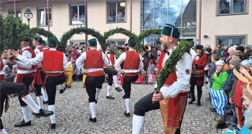 Auch in Obing herrschte Stimmung, als die Wasserburger Schäffler mit der Stadtkapelle vor vielen Schaulustigen am Rathausplatz einzogen. Zum Abschluss des Tanzes stiegen Schäfflermeister und Oberkasperl auf das Fass und grüßten mit „Servus Obing“, einem Schnapserl und einem Trinkspruch Bürgermeister