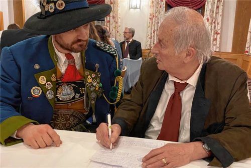 Am Rande der Feierlichkeiten des 100-jährigen Jubiläums des Schützengaus Wasserburg-Haag traf Schützenmeister Ludwig Meindl (rechts) vom Haager Schwarzpulververein den amtierenden Weltmeister in den Vorderladerdisziplinen Andreas Wimmer (links). Der Meisterschütze der FSG Prien aus dem Gau Traunstei