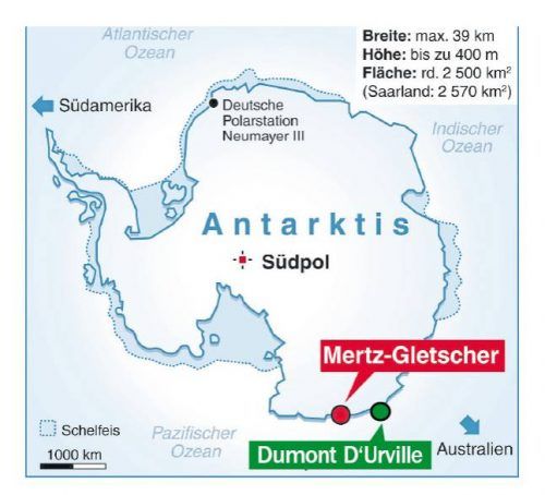 Die Grafik zeigt den Weg des gigantischen Eisbergs mit Namen C28 vom Mertz-Gletscher in Richtung der Pinguin-Kolonie in der Nähe der Forscherstation Dumont D’Urville. Die Wissenschaftler untersuchen die beiden Pinguinarten, die in der Antarktis leben: Kaiserpinguine und Adeliepinguine. Bisher wurden