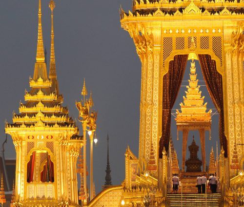 Mehr als ein Jahr nach seinem Tod hat Thailand endgültig Abschied von König Bhumibol genommen. Mit einer großen Prozession nach einem jahrhundertealten Ritual wurde eine symbolische Urne in Bangkok aus dem Großen Palast zu einem eigens gebauten Krematorium gebracht (Foto links – unser Foto unten rec