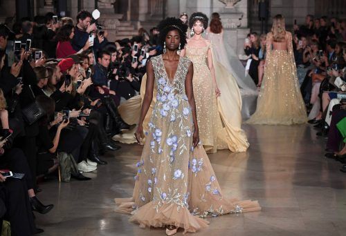 Mit einem Traum von Afrika hat das Pariser Modehaus Schiaparelli in der französischen Hauptstadt die Haute-Couture-Schauen für Frühjahr und Sommer 2018 eröffnet. Kostbare Stickereien bildeten die ornamentalen Muster der Massai nach, schwarze taillierte Jacken waren aus Bananenblättern und Seide gefl