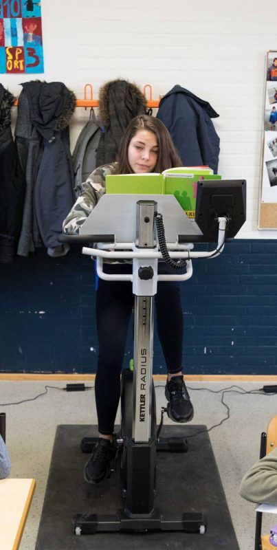 Nach rund einem Jahr mit Heimtrainern im Unterricht haben Bremer Schüler gestern Standfahrräder bekommen, die eigens für Klassenzimmer entwickelt sind. In der Bremer Schule gibt es derzeit sechs Klassen, in denen jeweils zwei bis drei Sportgeräte mit Tischplatten stehen. Abwechselnd können Kinder de