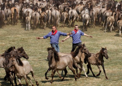 Wildpferd-Fangen Den traditionellen Wildpferdefang im Naturschutzgebiet Merfelder Bruch bei Dülmen haben am Samstag 15 000 Besucher beobachtet. Dabei ließ der Besitzer 36 junge Hengste einfangen. Geschehe das nicht, würde die 400 Tiere große Herde auf der rund 360-Hektar-Fläche zu groß. Nach Kritik