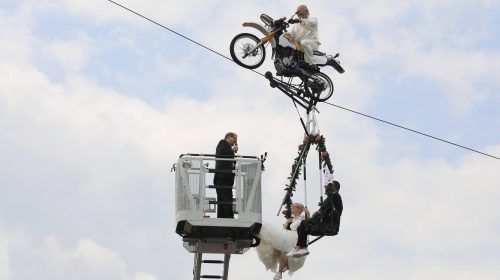 Hochzeit mit Nervenkitzel: Ein junges Paar hat sich bei einem Volksfest in Staßfurt (Sachsen-Anhalt) an einem Hochseil hängend das Ja-Wort gegeben. Falko Traber aus der berühmten Artistenfamilie fuhr Nicole Backhaus und Jens Knorr auf dem zwischen Wehrturm und Stadtmauer gespannten Seil in luftige 4