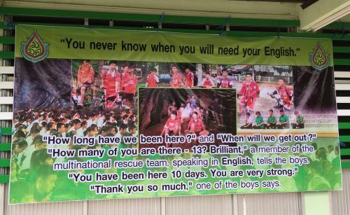 Das Drama um die in einer Höhle eingeschlossene Fußballmannschaft wird in Thailand jetzt auch als Mahnung genutzt, im Englisch-Unterricht besser aufzupassen. In der Prasitsart-Schule der nordthailändischen Gemeinde Mae Sai, wo sechs der zwölf Jungen unterrichtet werden, hängt nun ein großes Plakat z