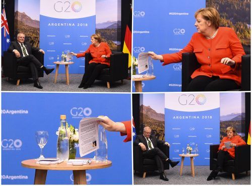 Mit ihrem Zettel für ein Treffen mit dem australischen Premierminister Scott Morrison beim G20-Gipfel in Argentinien sorgt Bundeskanzlerin Angela Merkel (CDU) in dessen Heimatland nachträglich für Belustigung. Auf einem Foto der Begegnung vom Samstag in Buenos Aires ist zu sehen, wie sich die Kanzle
