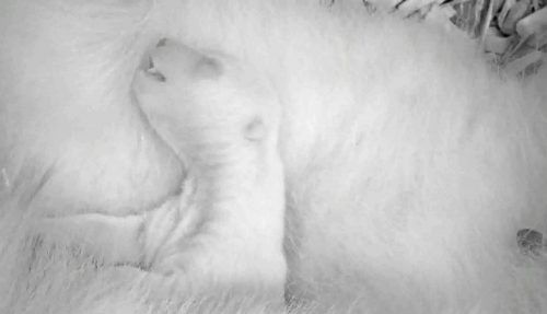 Sanft schlummert das Samstagfrüh geborene Eisbärenjunge im Berliner Tierpark zwischen den Tatzen seiner Mutter Tonja (9), zeigen Fotos vom Donnerstag. Die ersten Wochen im Leben eines Eisbären sind kritisch. Foto:: Tierpark Berlin/dpa