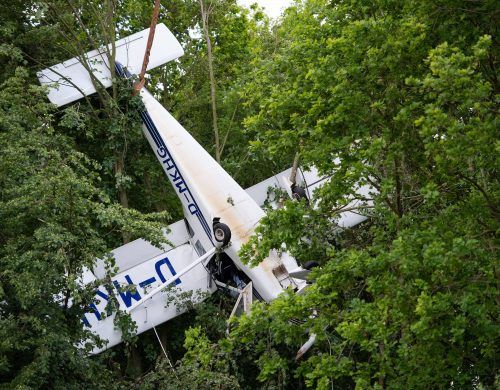 Spektakuläres Ende eines Fluges: Ein mit zwei Personen besetztes Kleinflugzeug ist im nordrhein-westfälischen Holzwickede bei Unna kopfüber in einer Baumkrone hängen geblieben. Der 56-jährige Pilot und seine Ehefrau (51) wurden von Höhenrettern der Feuerwehr geborgen. D