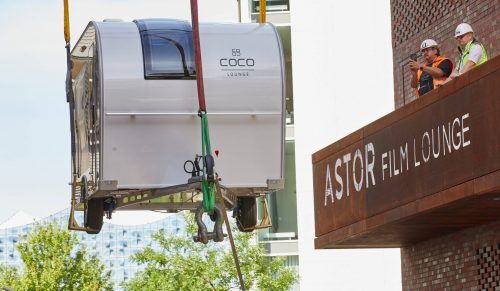 Kommt ein Wohnwagen geflogen: Das Hamburger Familienhotel Pierdrei hat gestern drei der Anhänger auf seine Dachterrasse gestellt. Dort wird man in Zukunft in sieben Metern Höhe campen können. Wendt/DPA