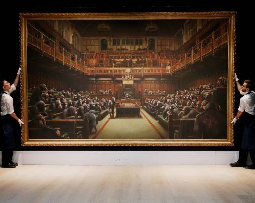 London – Das britische Parlament von Affen bevölkert – für dieses Werk des britischen Street-Art-Künstlers Banksy ist bei einer Auktion in London die Rekordsumme von 9,9 Millionen Pfund (11,1 Millionen Euro) erzielt worden. Bei der 13-minütigen Versteigerung gingen die Gebote für das Ölgemälde aus d