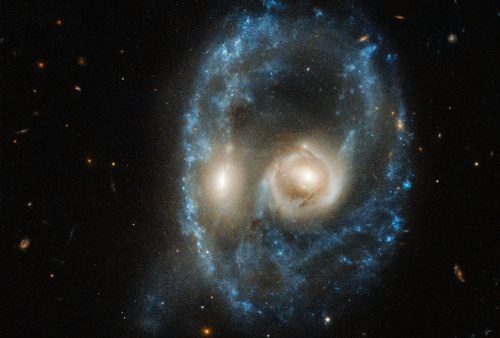 Das Weltraumteleskop „Hubble“ hat eine ungewöhnliche Galaxienkollision abgelichtet. Die beiden verschmelzenden Galaxien wirken wie ein kosmisches Gesicht: Die Zentralregionen der Galaxien bilden die „Augen“ der Formation, wie das europäische „Hubble“-Informationszentrum in Garching bei München mitte
