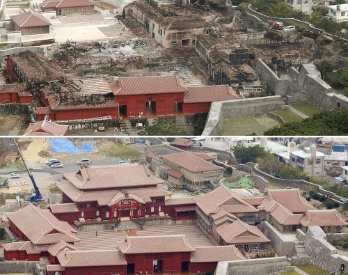 Ein verheerender Brand hat die zum Weltkulturerbe gehörende Shuri-Burg im japanischen Urlaubsparadies Okinawa zu großen Teilen in Schutt und Asche gelegt. Das Foto oben zeigt das Ausmaß der Zerstörung. Unten ist die Burganlage vor dem Brand zu sehen. Sieben Gebäude der historischen Burganlage wurden