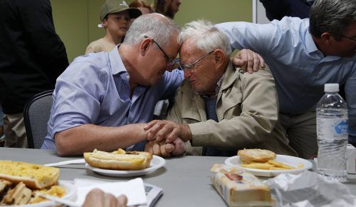 Der 85-jährige Owen Whalan kann nicht mehr. Eben musste er sein Haus im Staat New South Wales im Osten Australiens aufgeben – zu nah war das Buschfeuer gekommen. Australiens Premierminister Scott Morrison (links) nimmt den verzweifelten Mann in einer Notunterkunft tröstend in den Arm. Bei den verhee